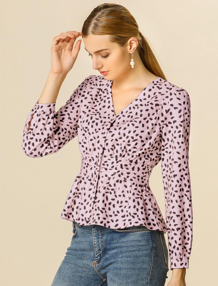 ソウテン ドット柄ブラウス ペプラム トップス Vネック スモックシャーリング レディース パープル L