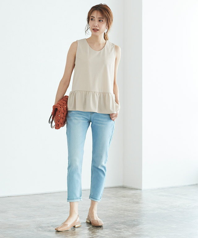 大人フェミニンスタイルに“フレアヘムノースリブラウス” 【素材】 “ドレープスパン”素材は、ツルッとした表面感でカジュアルになりすぎず上品な印象に。