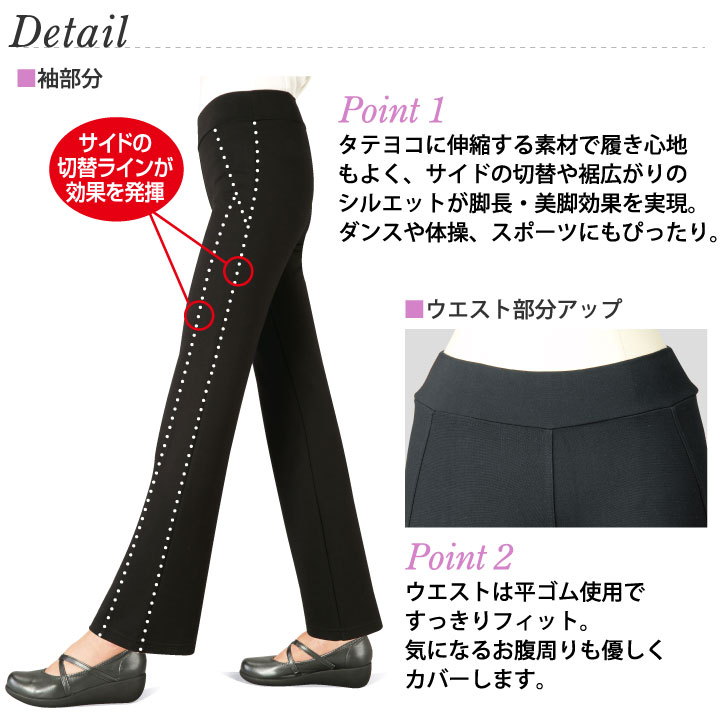 サイドの切替線がスッキリ細く見える美ラインパンツ。